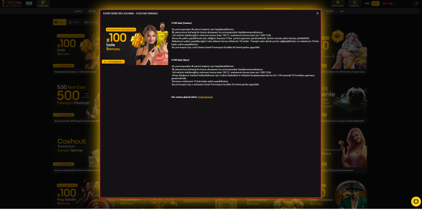 Canlı casino ve şans oyunlarının en çok kazandıranı Lordcasino, yepyeni bir bonus sistemi ile bahis severlerin para kaybetmeleri durumunda artık %100 iade bonusu ile tekrar kazanma şansı elde ediyor! Lordcasino üzerinden bahislerini gerçekleştiren tüm bahis severler iade bonusundan yararlanabileceklerdir. Canlı bahis ve canlı casino alanlarında kullanıcıların karşılaştıkları problemler ve şikayetleri dikkate alarak sıkıntısız bir şekilde aktif olarak bahis hizmetlerini durmaksızın devam ettiren Lordcasino, bu sebeple bahis severlerin bir numaralı tercihi olarak devam etmekte, her gün yeni kullanıcılarında ortak buluşma noktası olma konumuna gelmiştir. Lordcasino üzerinden bahis ve promosyonlara göz atmak ve incelemek için resmi internet sayfamızdan promosyonlar sayfasına inceleyebilirsiniz. Kaybetme halinde %100 iade bonusundan yararlanabilmek için kural ve şartlar uyulması gerekmektedir. Şartları ve kuralları karşılamayan kullanıcılar bonus talebinde bulunamazlar. Şartlar ve koşullar ise;